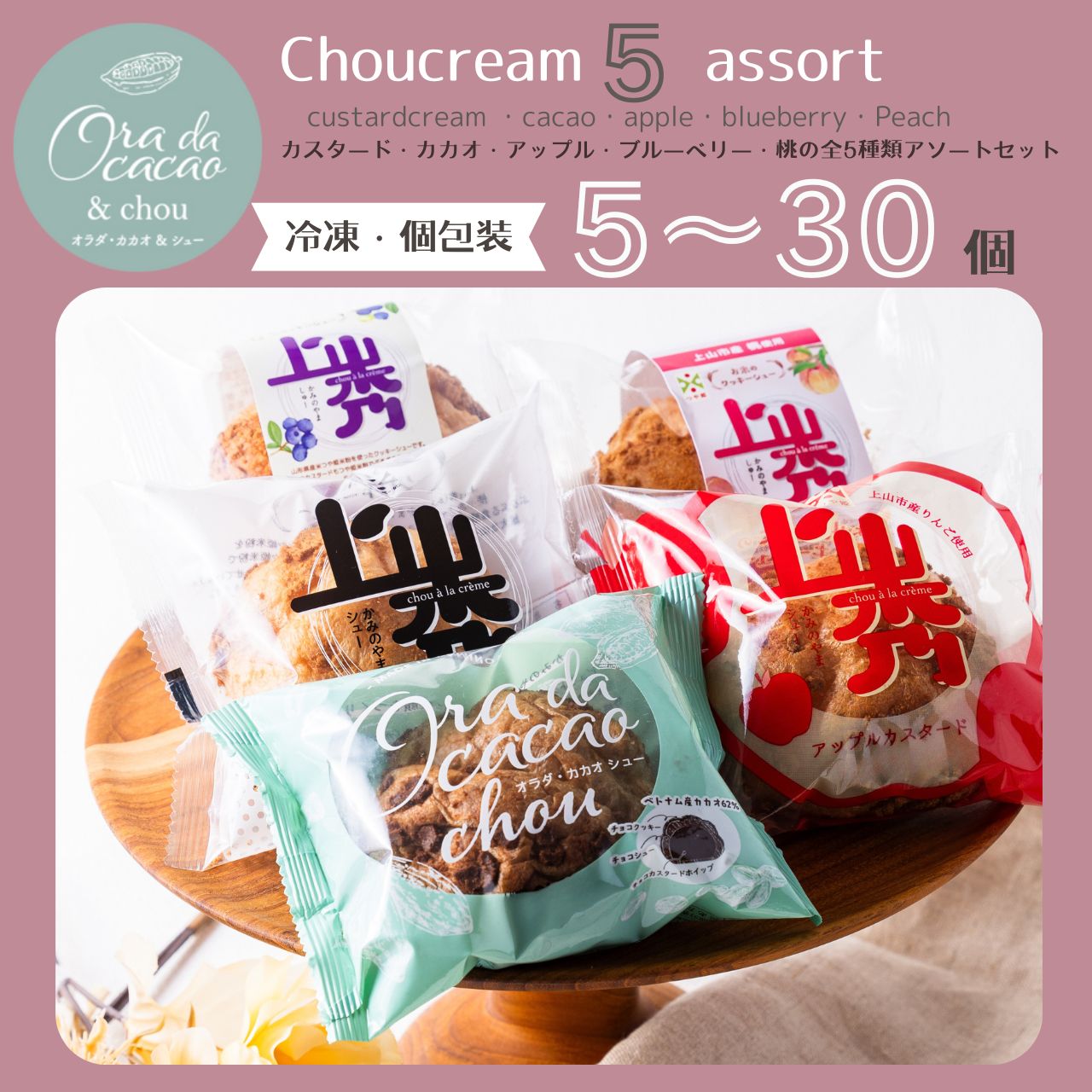 カスタード、カカオシュー、アップルシューの人気3種類にブルーベリーシュー、ももシューの2種類を追加した5個をご自宅用簡易箱にてお届けします。